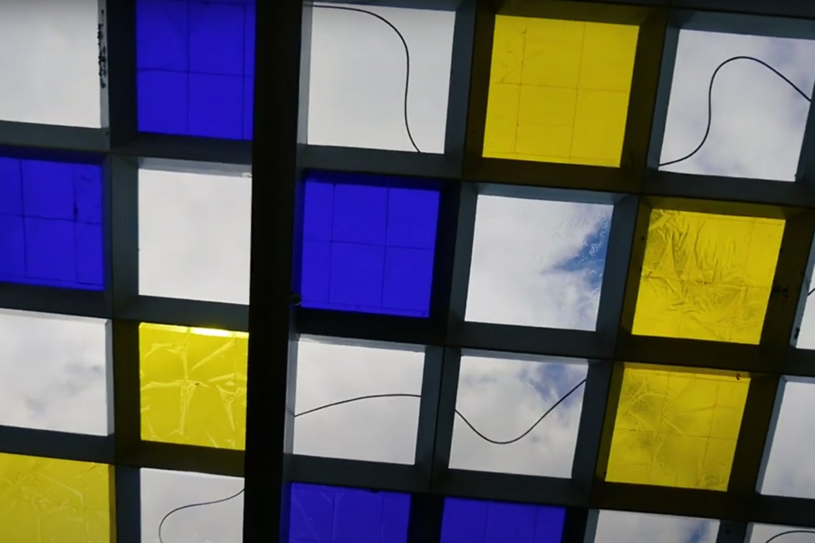A série de gravura digital com interferência em aquarela tem como ponto de partida o desenho criado a partir da planta da claraboia da Pinacoteca Luz e as cores dos elementos utilizados na instalação orbitando a [im]permanência do sol e a constância das águas.